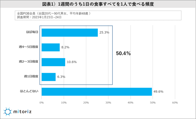 最初に「1日の食事すべてを1人で食べる頻度が一週間でどれくらいあるか」を尋ねたところ、「ほとんどない(49.6%)」が最も多い回答となりましたが、次いで「ほぼ毎日(25.3%)」、「週2日~3日程度(10.6%)」という回答が続いており、回答者の4人に1人がほぼ毎日、1日のすべての食事を1人で食べることがわかりました。週1回以上の頻度でみると、2人に1人は1週間に1日は誰とも食事を共にしない日があるという結果となりました(図表1)。