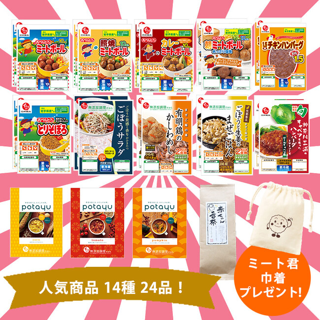 ロングセラー『イシイのおべんとクンミートボール』や、春の人気商品『神奈川三浦のキャベツを使ったハンバーグ トマトソース ロールキャベツ風』など 14 種 24 品を詰め込みました。