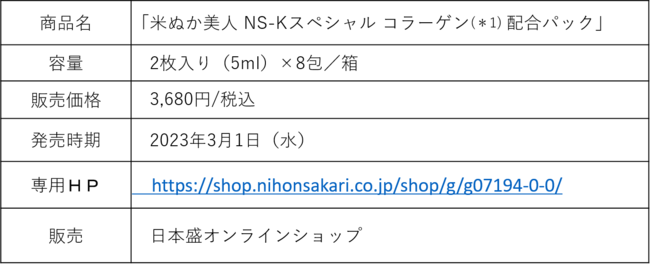 日本盛株式会社(本社:兵庫県西宮市、代表取締役社長:森本 太郎)は、「米ぬか美人 NS-Kスペシャル コラーゲン(*1)配合パック」を3月1日(水)より日本盛オンラインショップで新発売いたします。当商品は1987年(昭和62年)に、新規事業として1人の若手女性社員が発案し、酒屋の奥様の口コミで広がった「米ぬか美人」ブランド35周年の記念商品「米ぬか美人 NS-K ハーバルオイルエッセンス」に続く、第2弾の記念商品です。
