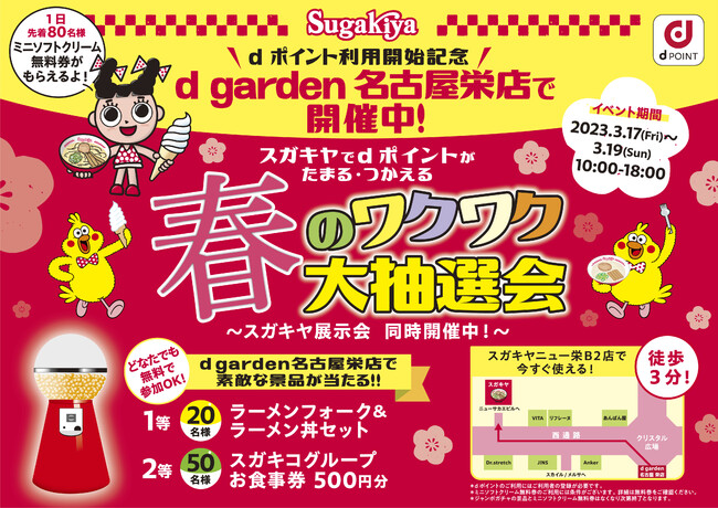 スガキヤでの「dポイント」サービス取り扱いを記念して、『スガキヤでdポイント最大5倍進呈キャンペーン』および「d garden名古屋栄店」において、『スガキヤ dポイントサービス開始記念イベント』を開催いたします。