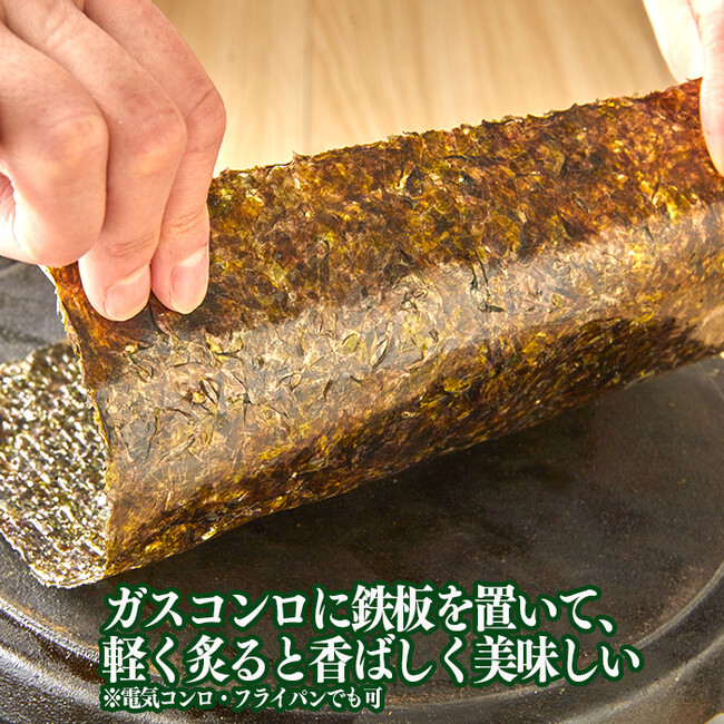 そのままでも充分美味しいのですが、コンロに鉄板やフライパンなどを敷いて海苔の端をもって軽く典範に押し付けるように滑らせて炙ると、見た目だけでなく味や香りも一層引き立ちます。