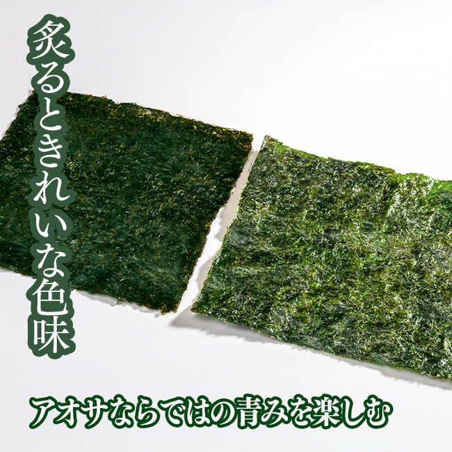 青とび海苔は、艶やかな黒い海苔のところどころに飛んだ緑色が美しく、海苔の味わいとアオサノリ香りの両方が楽しめます。海苔好きな通の方の中でも知る人ぞ知る海苔で、一度味わうと病みつきになる人も出る海苔です。軽く炙るとさらに青みが浮き出て目でも楽しめます。