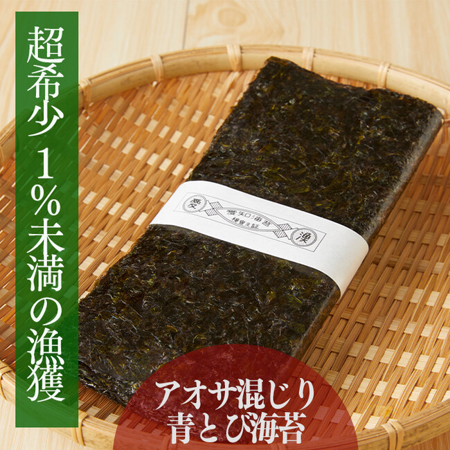 知る人ぞ知る海苔で、他にも「青まぜ」「混ぜ海苔」「青まざり」「こん海苔」「錦海苔」など様々な呼称があります。生産時期も海域も限定されるため、生産量は海苔全体のわずか1%。