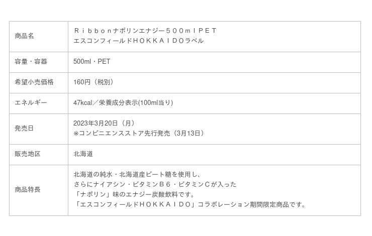 サッポロホールディングス(株)のグループ企業である、ポッカサッポロフード&ビバレッジ株式会社(代表取締役社長:時松浩、本社:愛知県名古屋市)は、北海道の子どもたちとともに成長し、うれしい時、楽しい時、頑張った時に寄り添ってきた「Ribbonブランド」から、新球場「エスコンフィールドHOKKAIDO」とコラボレーションした「Ribbonナポリンエナジー500mlPETエスコンフィールドHOKKAIDOラベル」を新発売し開幕を盛り上げます。