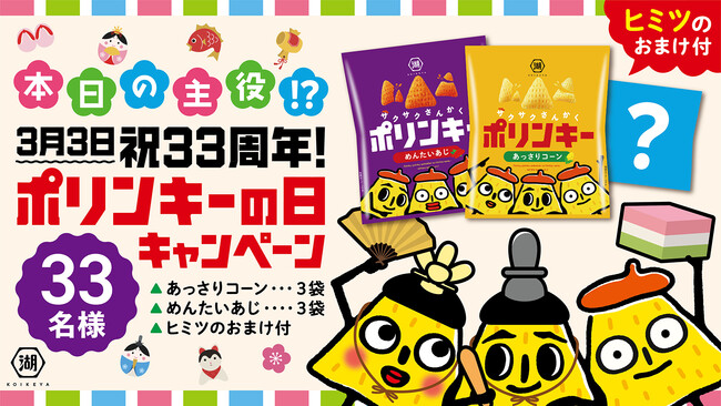 株式会社湖池屋(本社:板橋区/社長:佐藤章)は、3月3日(金)の「ポリンキーの日」より、2023年7月で発売33年を迎える「ポリンキー」ブランドをお祝いするとともに、長年ご愛顧いただいているお客様への感謝を込めて、抽選で33名様に商品の詰め合わせが当たるキャンペーンを実施します。