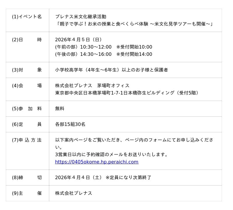 当社は、日本の米食文化の魅力を次世代へつなぐ取り組みとして、「米育(こめいく)」を推進しています。このたび、4月5日(日)、プレナス茅場町オフィス(中央区日本橋茅場町)にて、「親子で学ぶ!お米の授業と食べくらべ体験」イベントを午前と午後の2回、無料で開催いたします。