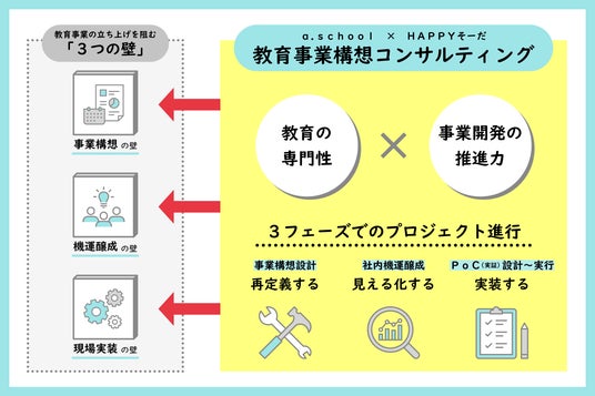 探究・創造的な学びを推進する株式会社a.school(所在地:東京都文京区、代表取締役:岩田拓真、以下「エイスクール」)と、教育事業の事業開発支援を行う合同会社HAPPYそーだ(共同代表・COO:余島純)は、企業・自治体等における新規教育事業の立ち上げや、既存教育事業の抜本改革を支援する「教育事業構想コンサルティング」の協働提供を開始します。