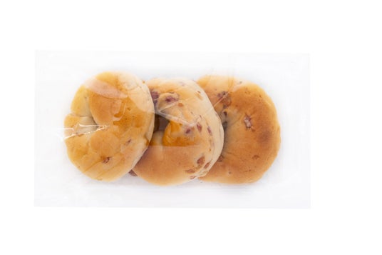 マカダミアナッツの食感が良いアクセントになっています。熱湯でこねて、小麦粉中の澱粉を糊化させた『湯種』と米粉を使用することで、もっちりとした食感に仕上げました。程よい食感を残したマカダミアナッツとクランベリーの甘酸っぱさの相性がよく、ほんのり甘みのあるでそのままでもおいしくお召し上がりいただけます。軽くトーストしていただくともっちり感がより一層引き立ちます。クリームチーズを合わせていただくと、クランベリーの甘酸っぱい味わいと相性抜群です。