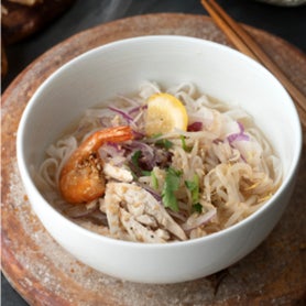 「ご家庭でも本場の味を楽しんでいただけるようなエスニック惣菜をお客様にご提供したい」という開発者の想いのもと、2009年に発売した商品。一番のこだわりはスープ。ガラスープやナンプラー、白ワインを合わせ、ショウガとレモンを効かせた優しい味わいに仕上げました。麺は、本場ベトナムの平打ち麺を使用。トッピングには、さっぱりとした味わいのスープに調和しつつ、彩りの良い具材として、蒸し鶏、もやし、赤玉葱、パクチー、海老をのせています。