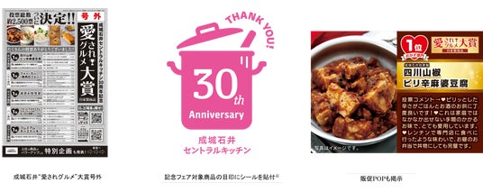 記念フェアの開催に合わせて、「成城石井“愛されグルメ”大賞」号外を本日3月6日(金)より各店舗で配布いたします。お客様には、この号外をもって大賞受賞商品とその他商品の順位を発表いたします。また、売場ではフェア対象商品がひと目でわかるように、「増量」「徳用」の特別規格品にセントラルキッチン30周年のロゴを記載したシールを貼付※します。また、各商品に販促POPを掲示して展開いたします。