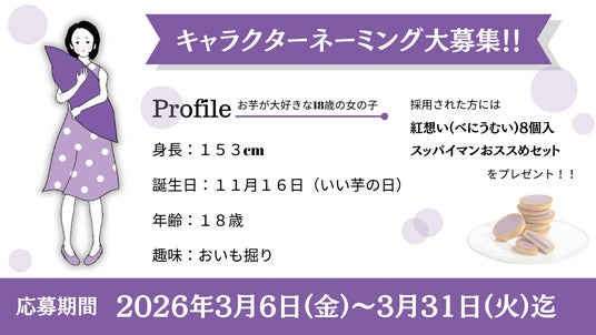 「紅想い」のパッケージに描かれている少女キャラクターの公式ネーミングを一般募集します。本キャラクターは「お芋が大好きな女の子」をコンセプトとしたオリジナルキャラクターです。以下のプロフィール設定をもとに、親しみやすく覚えやすい名称を募集します。