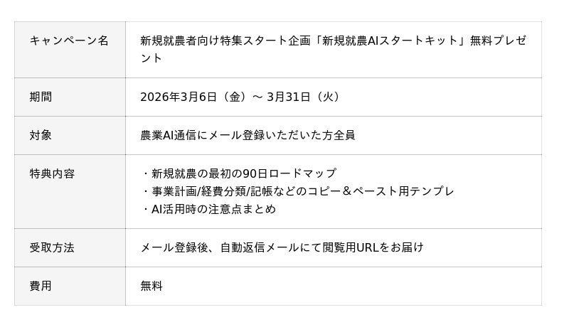 農業×新技術を推進する農家支援コミュニティ「Metagri研究所」(運営:株式会社農情人、本社:千葉県船橋市、代表取締役:甲斐雄一郎)が展開する農家向け特化型AIメディア『農業AI通信』にて、新規就農者向け特集を開始します。開始を記念して、申込者全員に今日から活用できるWebページ形式の特典「新規就農AIスタートキット」を提供。さらに、希望者から3名限定で、無料の個別AIコンサルティングも実施します。