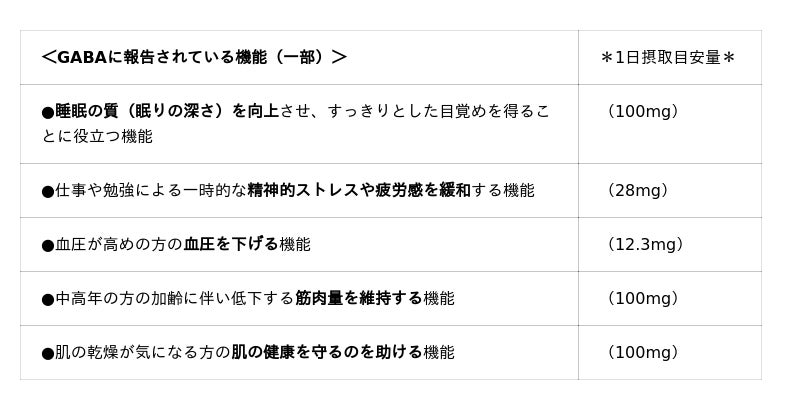 GABAはγ-アミノ酪酸と呼ばれるアミノ酸の1種で、以下に示されるような数々の機能が報告されています。