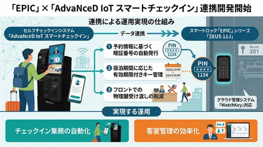 こうした背景を踏まえ、当社は月額費用不要でクラウド管理が可能なスマートロック「EPIC」シリーズと、「AdvaNceD IoT スマートチェックイン for クラウドスマートロック」との連携開発を開始しました。ランニングコストを抑えながら、チェックインから客室解錠までを一体化する新たな運用モデルの構築を目指します。