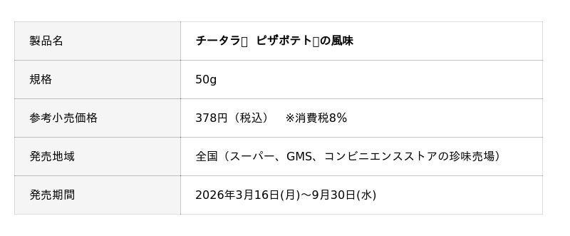 このたび、1992年から発売されロングセラー製品であるカルビー「ピザポテト(R)」とのコラボレーションフレーバーの「チータラ(R)」を発売いたします。