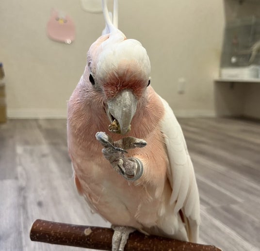 当店ふれあいスタッフ・クルマサカオウムの桃太郎くん(クルマサカオウムの展示もあるとのこと)