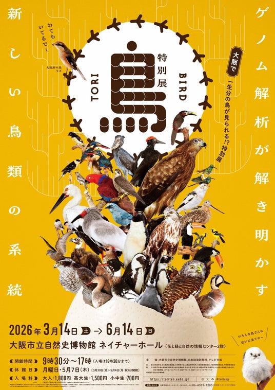 展覧会名:特別展「鳥 ~ゲノム解析が解き明かす新しい鳥類の系統~」会期:2026年3月14日(土)~6月14日(日)