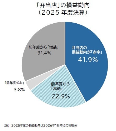 2025年に発生した、仕出しやテイクアウトを中心とした弁当店の倒産件数は55件で、前年(52件)を上回り年間最多を更新した。コンビニやスーパーなど競合先の増加に加え、近時は特にコメ価格の高騰が経営を圧迫しており、2024年度の弁当店の業績悪化割合は6割を超えた。物価高と節約志向の高まりで、特に低価格帯を得意とする中小弁当店の苦境が鮮明に。