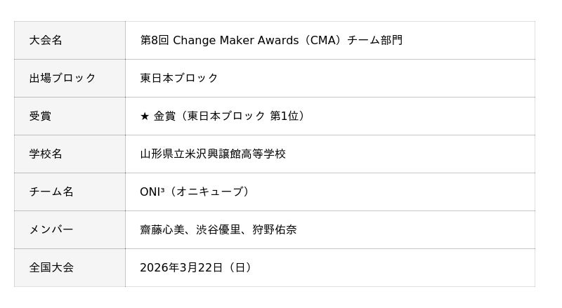 地域の魅力を実力に変える観光まちづくり法人、プラットヨネザワ株式会社(所在地:山形県米沢市、代表取締役 宮嶌浩聡)は、同社がSSHコーディネーターとして探究活動を支援してきた山形県立米沢興譲館高等学校のチーム「ONI3(オニキューブ)」(齋藤心美さん、渋谷優里さん、狩野佑奈さん)が、高校生による英語プレゼンテーションコンテスト「第8回 Change Maker Awards(CMA)」地方ブロック決勝においてチーム部門・東日本ブロック金賞を受賞し、2026年3月22日(日)開催の全国大会への出場権を獲得しましたのでご報告いたします。