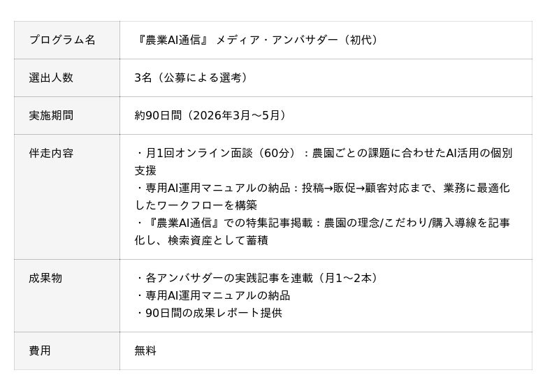 農業×新技術を推進する農家支援コミュニティ「Metagri研究所」(運営:株式会社農情人、本社:千葉県船橋市、代表取締役:甲斐雄一郎)は、農家向け特化型AIメディア『農業AI通信』にて公募した「初代メディア・アンバサダー」として、3名の農家を選出いたしました。3名は2026年3月より90日間にわたり、それぞれの現場でAI活用に取り組み、その全過程──試行錯誤や壁にぶつかるプロセスも含めて──を連載記事として公開します。また、3名の決定を記念し、農業AI通信のメルマガ登録者限定で「0日目 ── はじめの一歩の裏側」(各アンバサダーの応募背景・現場の課題・AI活用の方向性)を先行公開いたします。