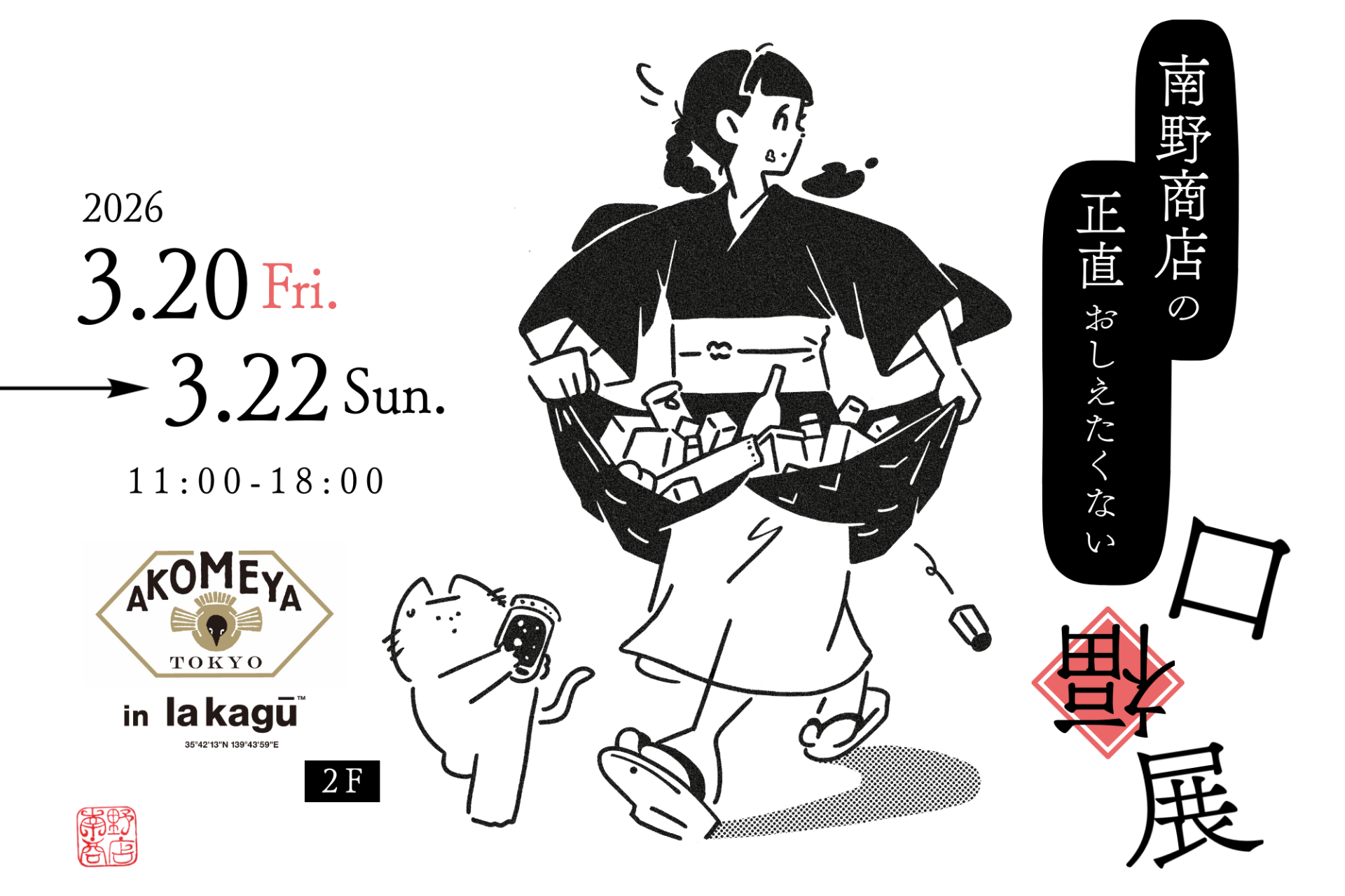 株式会社南野商店(本社:東京都世田谷区、代表:南野マキ)は、2026年3月20日(金・祝)~22日(日)の3日間、東京・神楽坂のAKOMEYA TOKYO in la kag?にて、全国12の食品ブランドの作り手が集う食イベント「南野商店の正直おしえたくない口福展」を開催いたします。