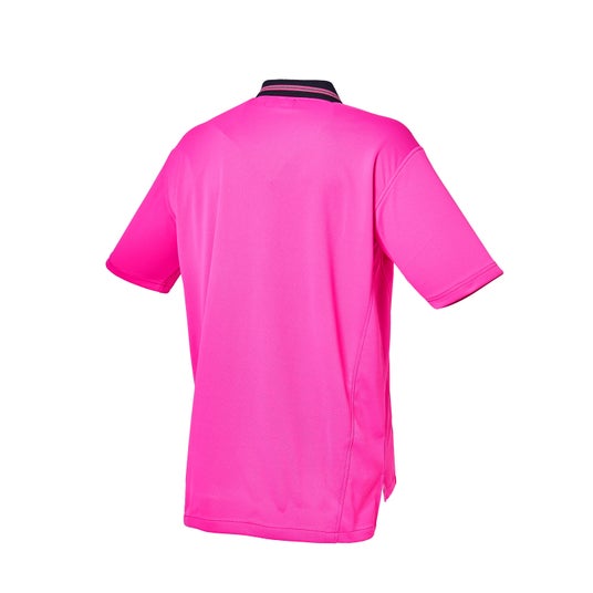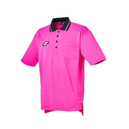 カラーは鮮やかなピンクを基調とし、襟元にはブラックを配色。通気性に優れた吸汗速乾素材を採用した審判半袖シャツです。