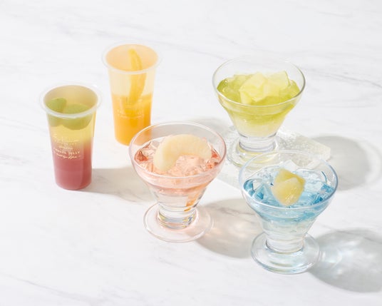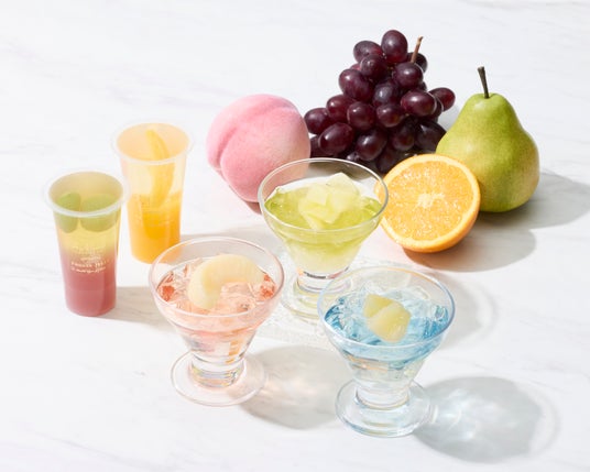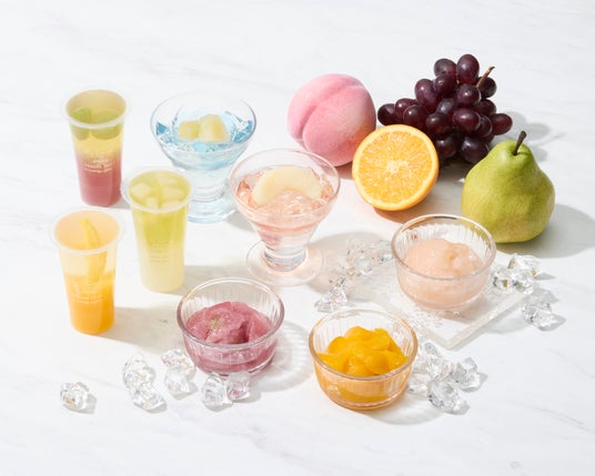 ごろっとした大粒の果肉を贅沢に閉じ込め、2種類のフレーバーを重ねたコントラストの美しいゼリーです 。パイン&ラムネやピーチ&ストロベリーなど、果実の個性を引き出した5種の味わいをご用意しました 。