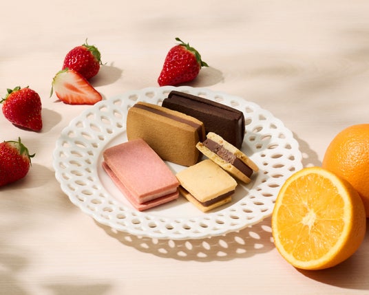 人気のショコラサンドに、季節限定の「あまおう苺」と「オランジュ」が登場 。定番のビターやキャラメルとのアソートもご用意しています 。