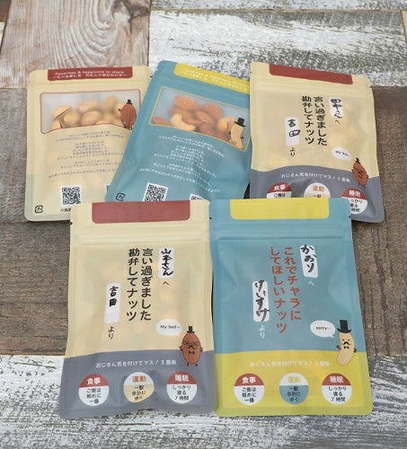 そこで小島屋は、ナッツの力を借りて夫婦や職場の人間関係を円滑にする(あるいは、うやむやにして危機を回避する)ための、おじさんのための生存戦略的コミュニケーションツールを開発いたしました。