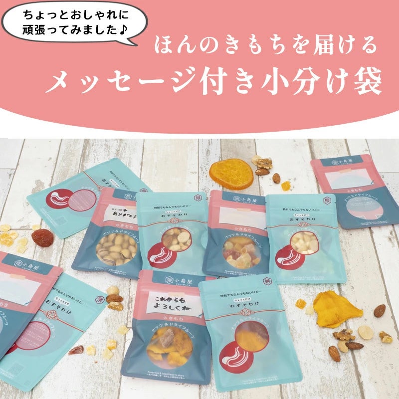 東京・上野のアメヤ横丁で創業68年、ナッツ・ドライフルーツ専門卸問屋の「小島屋(株式会社小島屋)」は、3月9日の「ありがとうの日」に合わせ、素直に謝れない大人の気持ちを代弁する「おじさんのきもち小分け袋」、および、自由なメッセージを添えられる「メッセージタイプ小分け袋」を2026年3月9日より発売いたします。
