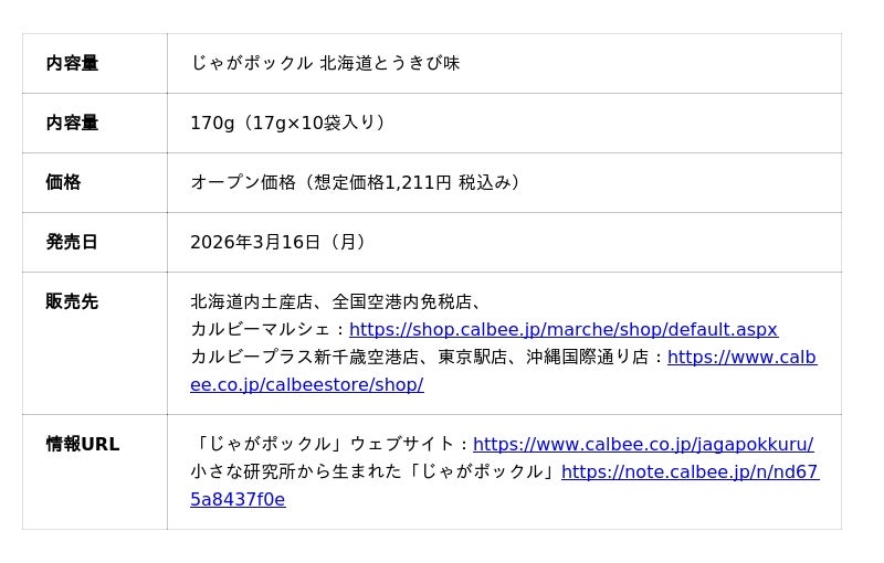 カルビー株式会社(本社:東京都千代田区、代表取締役社長兼CEO:江原 信)は、北海道土産のロングセラー商品「じゃがポックル」より、北海道産とうもろこしパウダーを使用した『じゃがポックル 北海道とうきび味』を2026年3月16日(月)から北海道内土産店、全国空港内免税店、およびカルビープラス新千歳空港店、東京駅店、沖縄国際通り店にて発売します。