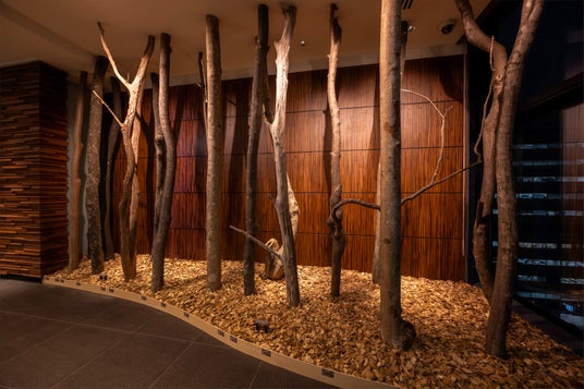 フロントロビーエリアは、札幌の街と里山のつながりを体感できる没入型の空間へと生まれ変わりました。ロビーに一歩足を踏み入れると、札幌の大地で育った木々の香りがふわりと広がり、まるで北海道の森に迷い込んだかのような没入感に包まれます。使用している木々は、札幌の里山地域である西区小別沢から運ばれたもので、桑の木やカエデなど5種類が並び、豊かな表情を空間に添えています。当ホテルは、札幌市の「里山活性化推進事業」に賛同し、街と里山のつながりをテーマに地域の魅力向上を目指す取り組みを応援しています。地域の農林業者や住民の方々とのつながりを通じ、ホテルとしても地域活性化に貢献したいという思いを込めています。