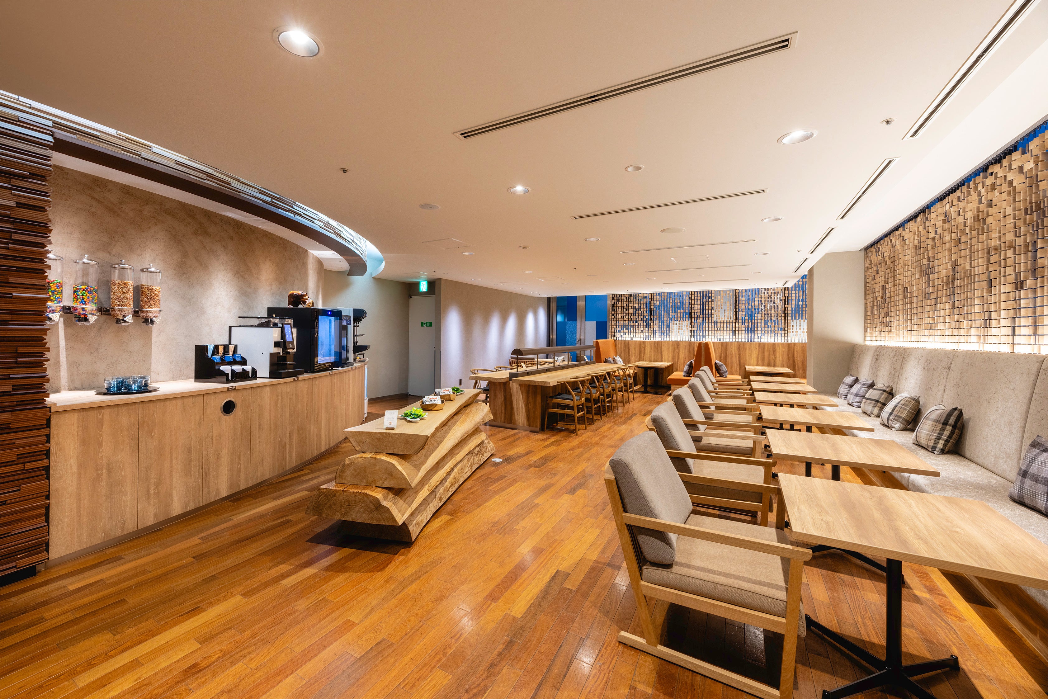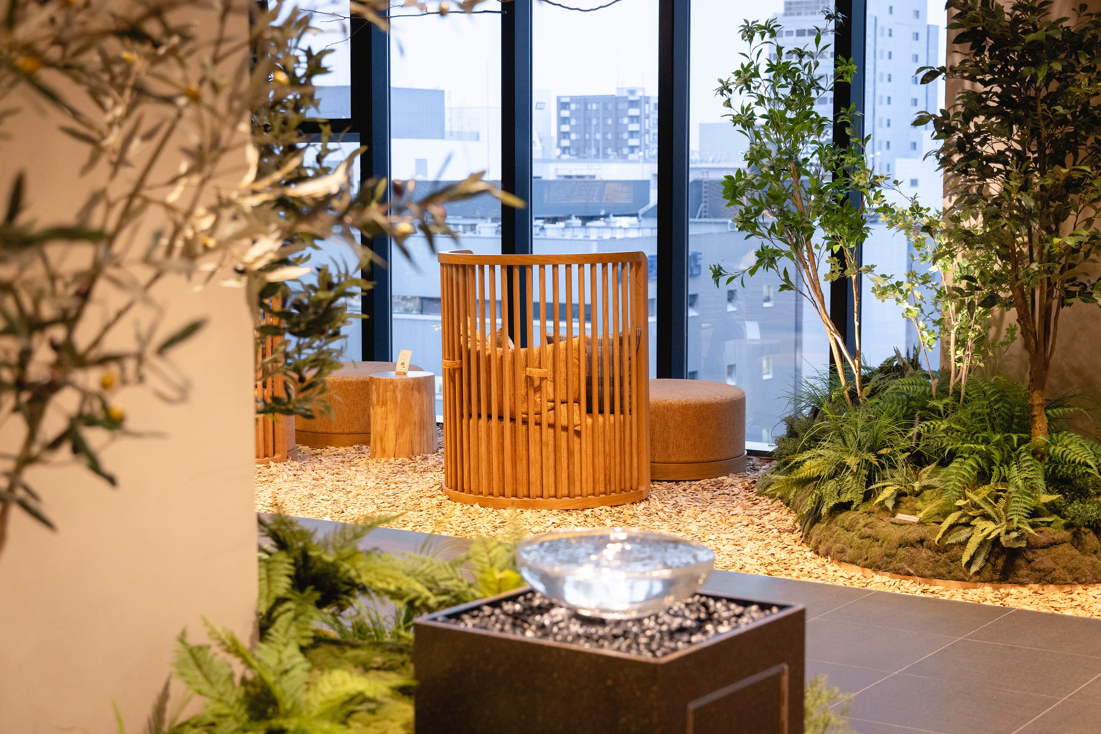 札幌市小別沢の桑やカエデの木々を配し、床には道南・厚沢部町のウッドチップを敷き詰めました。自然の香りとともに静かに響く水音が心を穏やかに落ち着かせてくれます。大きな窓からは季節ごとに移ろう札幌の街並みが広がり、差し込む光の揺らぎが心地よい開放感を演出します。新設のリラックススペースでは、靴を脱いで旅の疲れをほどく、穏やかでやさしい時間をお過ごしいただけます。木の香り、植栽の緑、水の音、光の表情など、自然が奏でるさまざまな“感覚”に寄り添うこのロビーで、北海道の魅力を心で味わうひとときをお楽しみください。