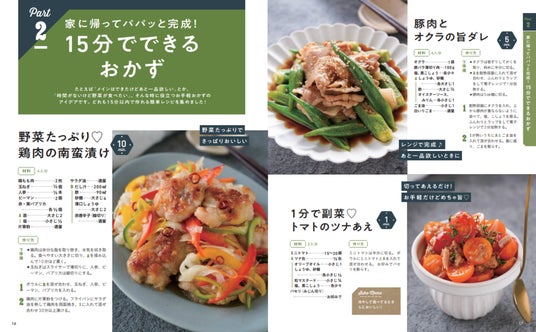 どのレシピも何度も試作を重ねて完成させたものだからこそ、失敗しにくく、おうちでも確実においしく作れるのが魅力です。仕事帰りでも15分で完成するパパッとメインおかずや、作業時間1分であえるだけの副菜、レンチン2分で完成するおかずなど、忙しい日でもすぐ真似できるアイデアがたっぷり詰まっています。