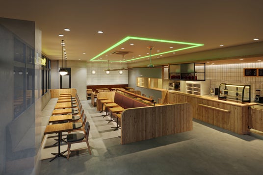 店内のレジカウンターや客席の仕切りには、樹齢約60年の杉を約10本使用し、約130kgのCO2を固定化しています。間伐材はリユースや二次加工が可能なため、長期的に店舗で活用できるだけでなく、環境負荷の軽減や持続可能な資源利用にもつながります。