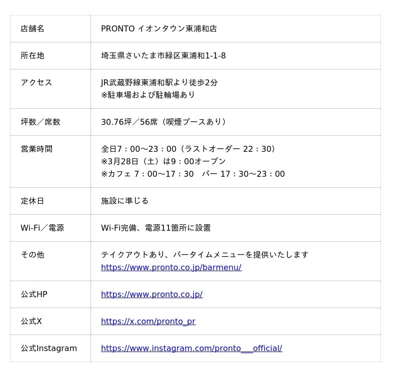株式会社プロントコーポレーション(本社:東京都港区、代表取締役社長:杉山和弘 以下、当社)は「PRONTO(プロント) イオンタウン東浦和店」を、2026年3月28日(土)にオープンすることをお知らせいたします。