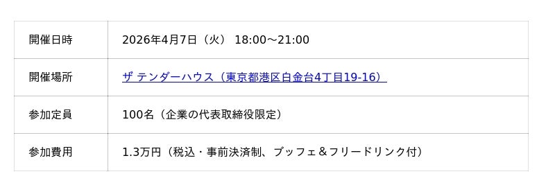 株式会社IR Roboticsは、Forbes JAPAN SALON とのコラボレーションで 、経営者限定セミナー&交流会「買収M&Aで会社を成長させる極意」を2026年4月7日(火)、東京都港区白金台のザ テンダーハウスにて開催いたします。ゲストスピーカーには、CCH代表取締役 兼 ホリイフードサービス(東証スタンダード 3077)取締役の高鍬 仁一 氏を迎え、M&A成功のための戦略と実践事例をお話しいただきます。