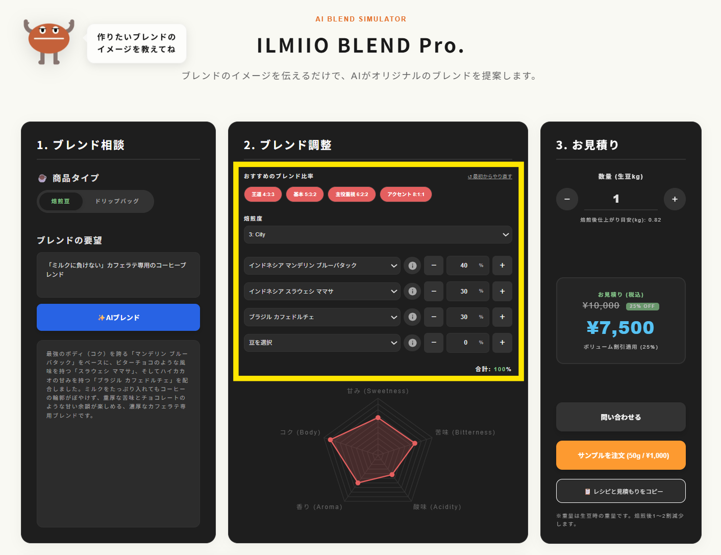 ILMIIO ROASTERY Lab.では、これまで一般のお客様向けにオリジナルブレンドが作れるサービス「ILMIIOブレンド」を提供してまいりました。このサービスでは、「どうブレンドしたらいいかわからない」という方のために、AIが好みに合わせたブレンドを提案する機能を搭載しております。「直感的に自分好みの味のブレンドが作れる」と多くの方にご好評をいただく中で、飲食店やカフェなどの法人のお客様にもお使いいただきたいとの思いに至りました。