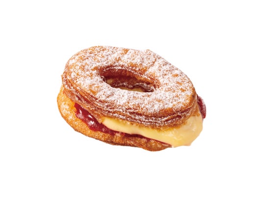 いちごのミルフィーユドーナツ 税込385円サクッと香ばしいクロワッサンドーナツに果肉感たっぷりのいちごとカスタードを重ねた、ミルフィーユをイメージした贅沢なドーナツ。