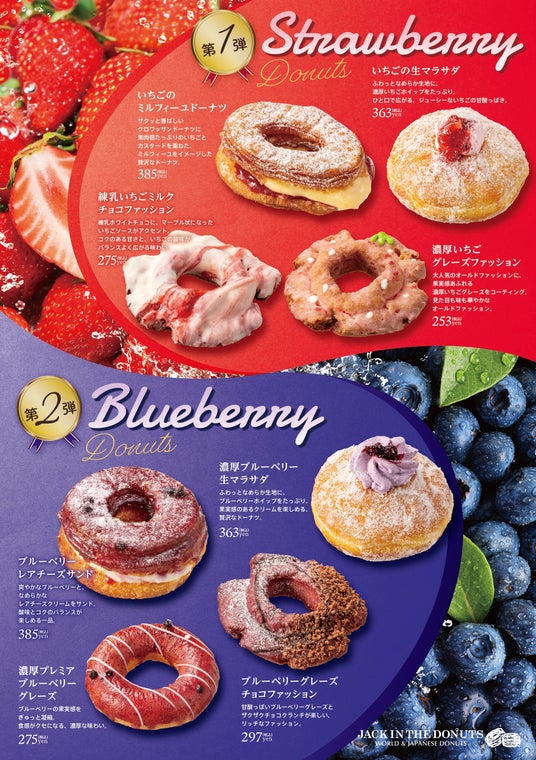 とり専門店『鳥さく』やタニタカフェとのコラボ店『鳥〇食堂×タニタカフェ』などの飲食店を全国に展開するビッグクリエイト株式会社(本社:東京都港区、代表取締役:北浦大作)は、『JACK IN THE DONUTS(ジャックインザドーナツ)』で、3月18日(水)よりいちごシリーズ4種を、4月24日(金)よりブルーベリーシリーズ4種を期間限定で販売いたします。