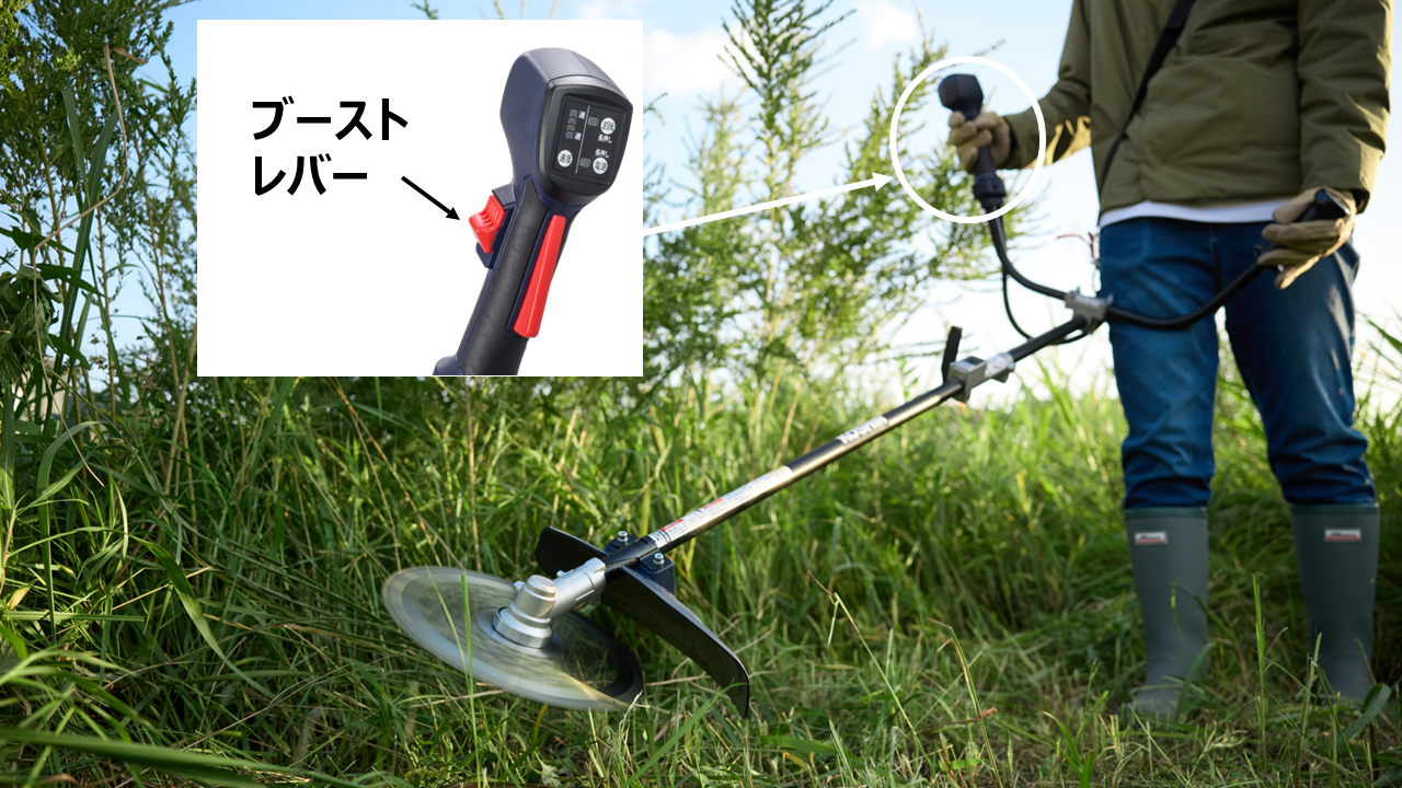 また、バッテリー残量を効率的に使用して草刈りするために、必要な時だけ瞬間に速度を上げることができるブースト機能がついています。例えば、草が密集した場所では、停止させて速度調整することなく、ブーストレバーをスライドさせるだけで瞬間的にスピードが上がり、草を刈ることができます。必要な時に必要な時だけ、高速回転させるのでバッテリー残量の消費を押さえることができます。