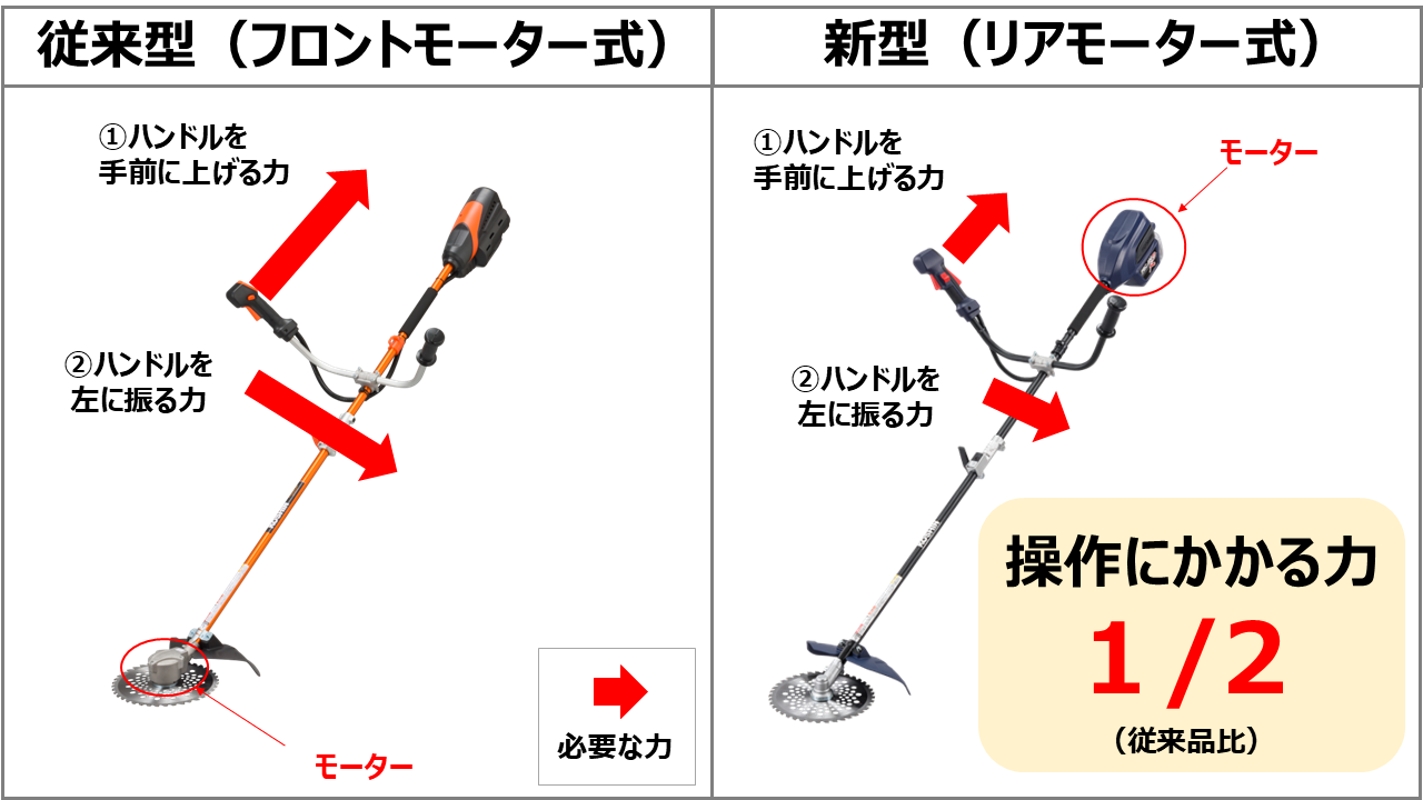 刃の先端を左右に振って草を刈る作業はとても疲れる作業です。従来の充電式草刈機(弊社従来型:PBC-3650)は先端の刃部分にモーターがついており、傾斜や不整地では先端を持ち上げて草を刈るのが大変との声も伺っていました。新型の充電式草刈機(PBC-400R)は後方にモーターを配置しているため、先端部分が軽く、刃の部分を左右に振りやすいため、従来の充電式草刈機に比べて操作する力が約半分(*2)になりました。