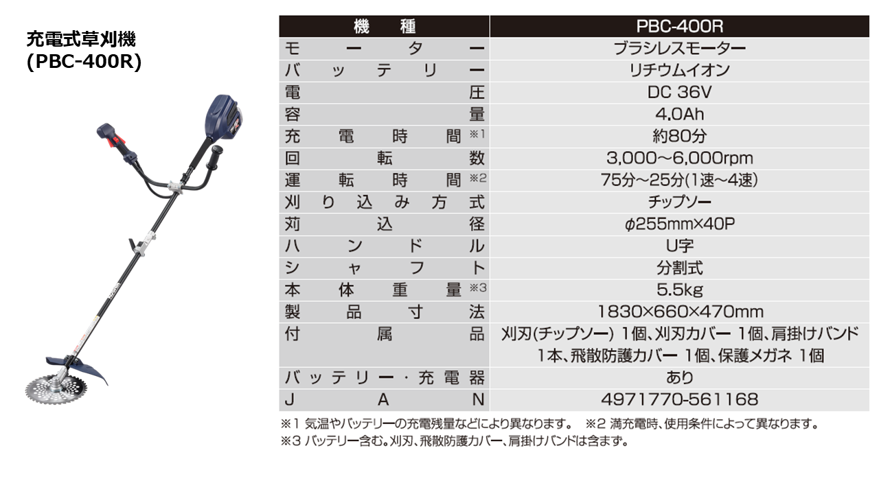 <充電式草刈機(PBC-400R)特徴>