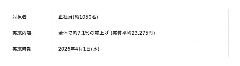 物価高騰が続く中、社員が安心して長く働ける環境を整えることが重要であるとの考えから、弊社創業者であり代表取締役会長の神田正が掲げる「分かち合う資本主義」の理念のもと、労使合意のうえ本改定を実施いたします。定期昇格による給与の引き上げ等を含めた賃上げ率は全体で約7.1%となり、成長分配金(2/27支給済み)を賃上げ額に含めた実質的な賃上げ率は、全体で約12.8%となります。