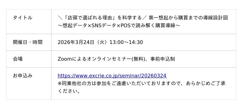 株式会社クロス・マーケティンググループのグループ会社でソーシャル&セールスプロモーションサービスを展開する株式会社エクスクリエ(本社:東京都新宿区、代表取締役社長:小笠原 亨)は、2026年3月24日(火)に、株式会社トライバルメディアハウス、株式会社MADSとの3社共同のオンラインセミナー『「店頭で選ばれる理由」を科学する 第一想起から購買までの導線設計図 ~想起データ×SNSデータ×POSで読み解く購買導線~』を開催いたします。