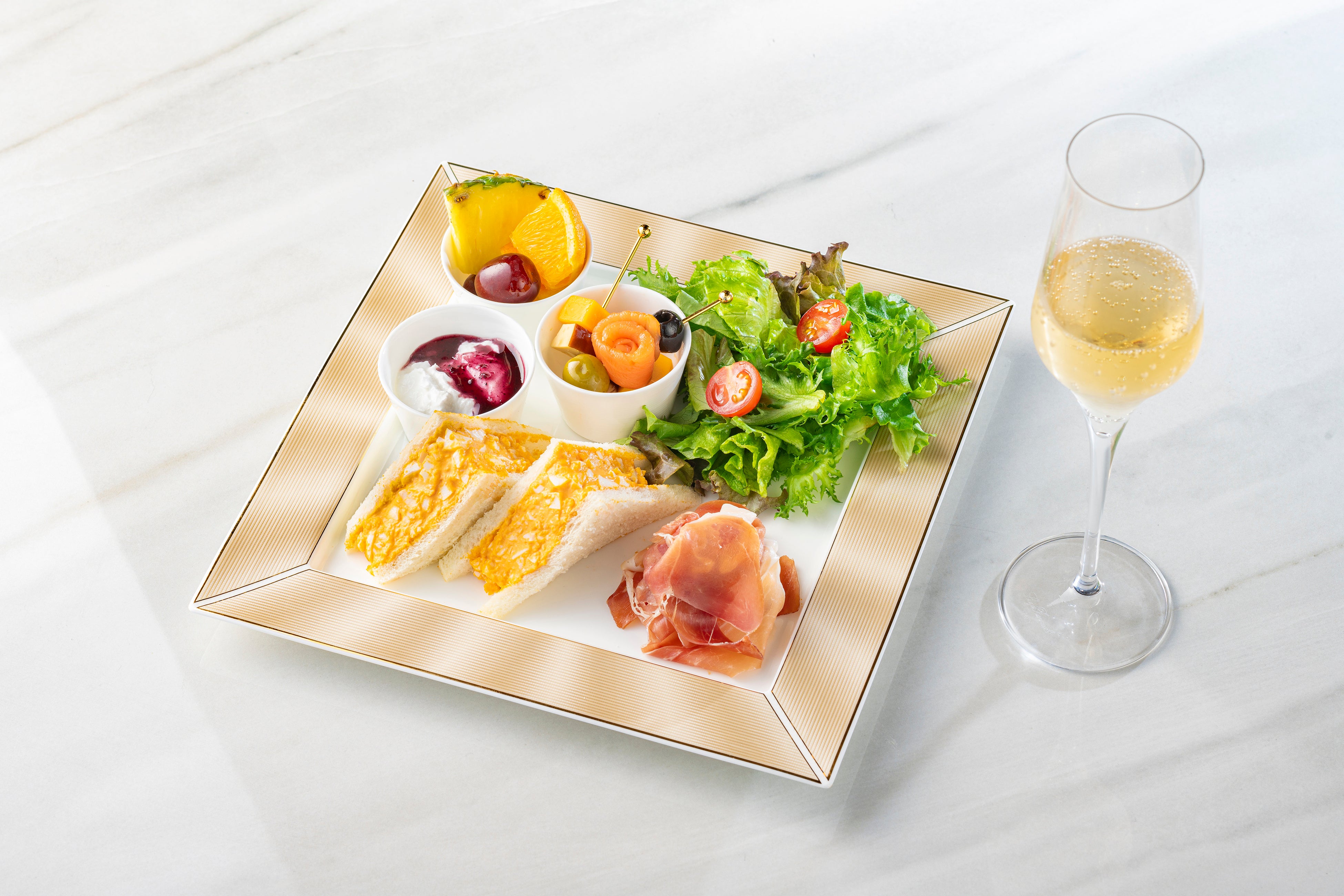 「THE C's SKY CAFE」では、スパークリングワインと愉しむ大人のモーニングプレートをはじめ、満足感のあるランチや心満たすケーキセットをご提供。自然光が差し込む開放的な空間で、ゆったりとした時間をお過ごしいただけます。