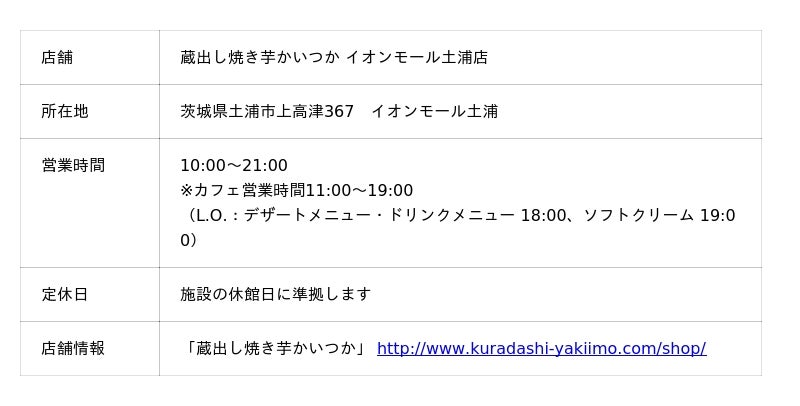 このたび、茨城県土浦市の『蔵出し焼き芋かいつか イオンモール土浦店』(旧店名「イオン土浦店」)は、これまでの商品販売中心の店舗形態から、焼きたて焼き芋に加え、カフェメニューも気軽に楽しめる店舗として、2026年3月16日(月)にリニューアルオープンいたします。