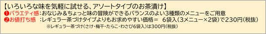 株式会社 永谷園(社長:掛谷 浩志、東京都港区)は、 現在発売中のお茶漬けバラエティパック「味わい茶漬け」「だし茶漬け」を、お茶づけライトユーザーのお客様が手軽にお手に取っていただける商品としてリニューアルいたします。