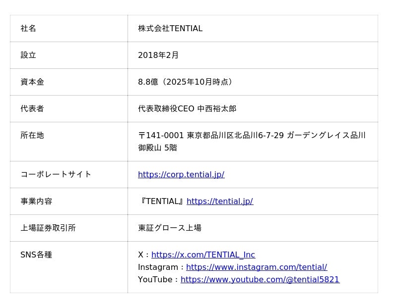 株式会社TENTIALは、「健康に前向きな社会を創り、人類のポテンシャルを引き出す。」をミッションに掲げ、コンディショニングブランド『TENTIAL』を運営しています 。代表取締役CEO中西裕太郎は、プロサッカー選手を目指した高校時代に病気で夢を絶たれた原体験から、自身のポテンシャルを最大限に発揮するためには健康と日々のコンディショニングが不可欠であると痛感。この経験から株式会社TENTIALを創業し、世の中に「コンディショニングを実装する」ことを目指しています。コンディショニングブランド『TENTIAL』は、アスリートの知見と最新技術・研究に基づき、機能性を追求した製品・サービスを提供。24時間365日、日常生活のあらゆるシーンで心身を整え、疲労回復やパフォーマンス向上をサポートするコンディショニング活動を推進しています 。すべては個人のコンディションとポテンシャルを引き出すという信念のもと、株式会社TENTIALは、健康に前向きな社会の実現のため、コンディショニングの社会実装に取り組んでまいります。
