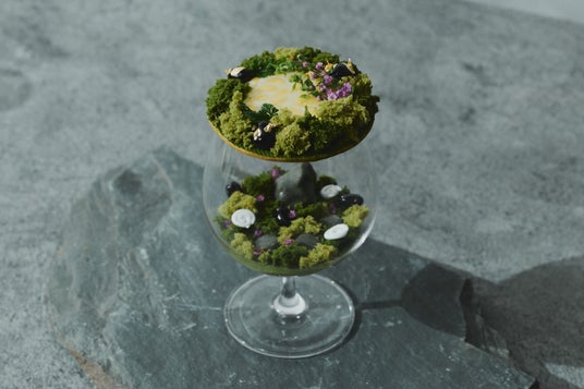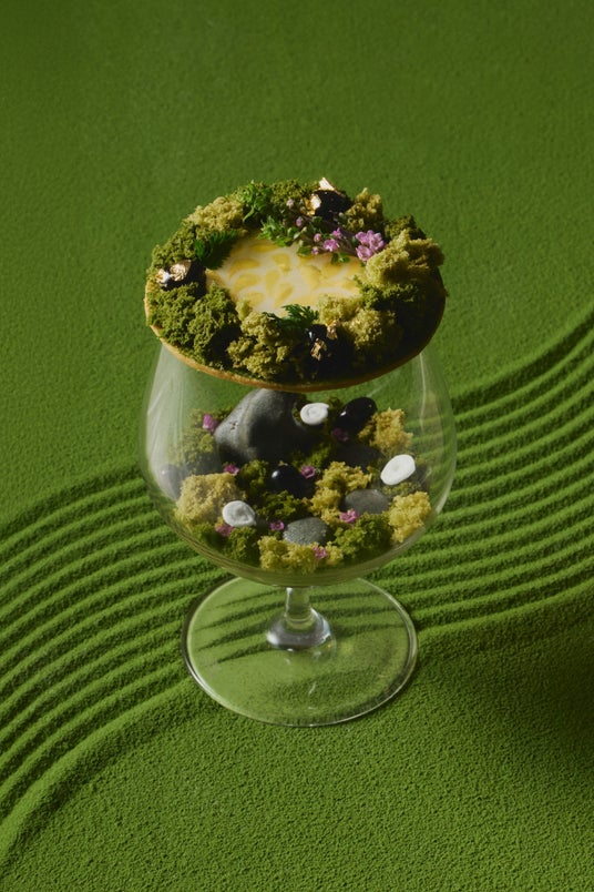 お席に着いてまず皆さまをお迎えするのは、爽やかなウェルカムドリンク「ゆず抹茶フィズ」と、ウェルカムデセール「箱庭パルフェ ~抹茶とゆずのテラリウム~」。グラスの中に広がるテラリウムをイメージしたパルフェは、抹茶とゆず、ショコラのハーモニーの中に濃淡のシフォンケーキや黒豆を配し、庭園に生す苔や岩を表現しました。庭園の様式美である“七五三石組(しちごさんいわぐみ)”の要素を取り入れた、遊び心とこだわりが詰まった一品です。